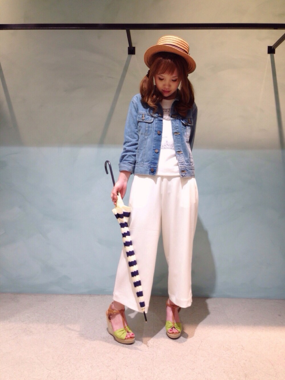 こんばんは~☪︎⋆。˚✩ 今日はLeeのデニムジャケットが羽織りたかったので、中身はシンプルに!! バンダナ柄プリントの白Tに トロミ素材のガウチョを合わせて白×白コーデ ♪♪ このバンダナ柄と同じ柄のトートバッグを 明日から¥10,000以上お買上げの方にプレゼントでーす⋆。˚✩ ♡先着80名♡ 来て下さいね~♪ 明日は私、お休みしますけど(✩´艸`) この黄緑色のサンダルは合わせにくいからかあんまり人気なかったけど、そんな事ないよー! かわいそうな感じで残ってたから私がお買上げ~٩(๑>∀<๑)و 買って大正解♪ そして物足りなかったから傘持った←またw 大丈夫!!もう二度と持ちませんm(_ _)m 今日も見て下さってありがとうございました❤