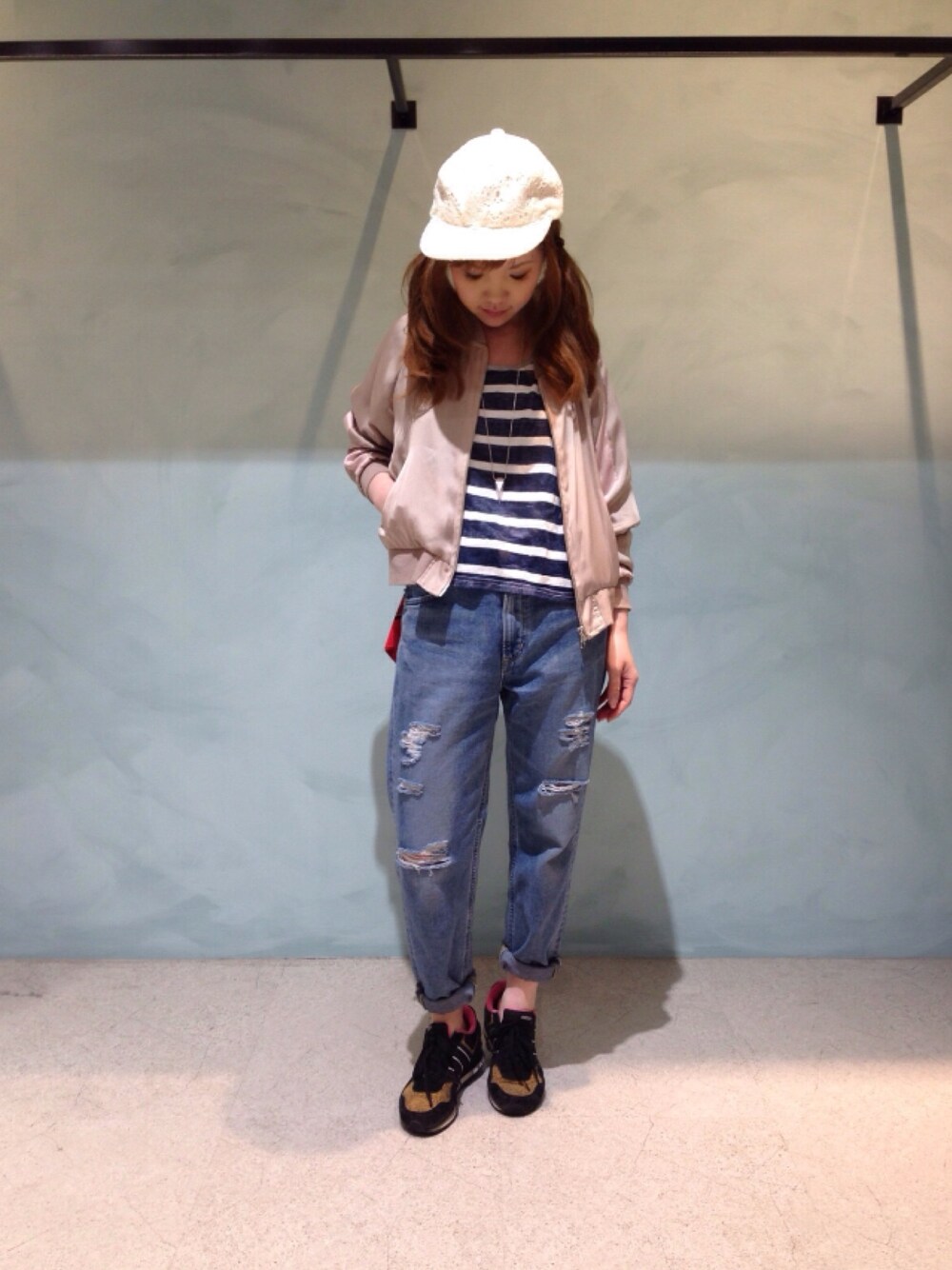 こんばんは(*ˊ˘ˋ*)♡ 今日の仕事中のstyleで簡単に♬︎*.:* 着回しコーデですみません💧 Leeのダメージデニム 透かしボーダーのトップス ベージュ×ピンクのスカジャン 最近暑くなってきたので空調が寒い!! スカジャンが毎日手放せません(*≧v≦) スニーカーだとおチビが目立つね(><) 今日も見て下さってありがとうございました❤