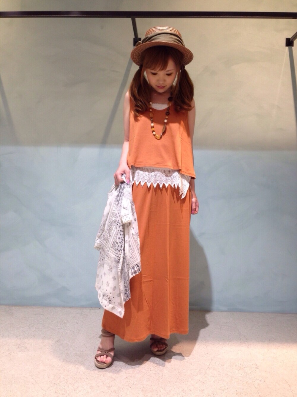 こんばんは~٩(๑>∀<๑)و 今日はワンピ風のセットアップ⋆。˚✩ 今年っぽくレンガ色~ レースキャミが良い感じに重なりました(๑><๑)✩ 暑いからバンダナ柄ガウン羽織るのやめた~♬*゜ お店でカンカン帽見つけると吸い寄せられるよーに被ってみるクセが...(^_^; また2色買いしちゃいました♪̊̈♪̆̈ 今日も見て下さってありがとうございました❤