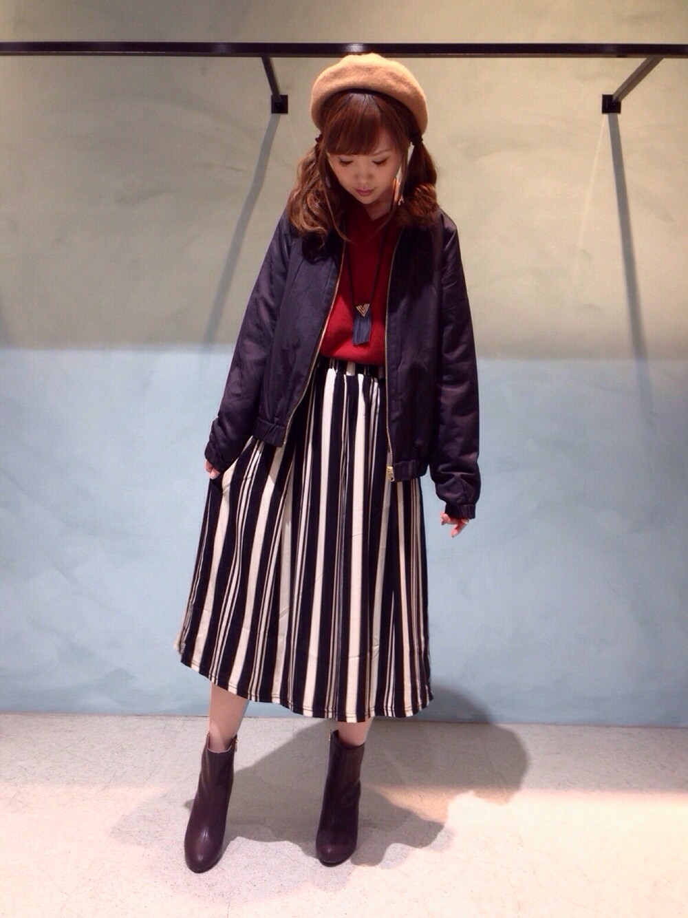 赤のVネックニットには黒のVアキブルゾンがよく合う(❁˘ ˘❁) ストライプのスカンツと合わせてスッキリ感&存在感ÜP♡ 今日の大阪は冬を通り越して春が来たみたいでしたよ🌸✨ 明日からは激寒って天気予報が脅してくるんですけど~(lll-ω-)チーン 今日もありがとうございました❤