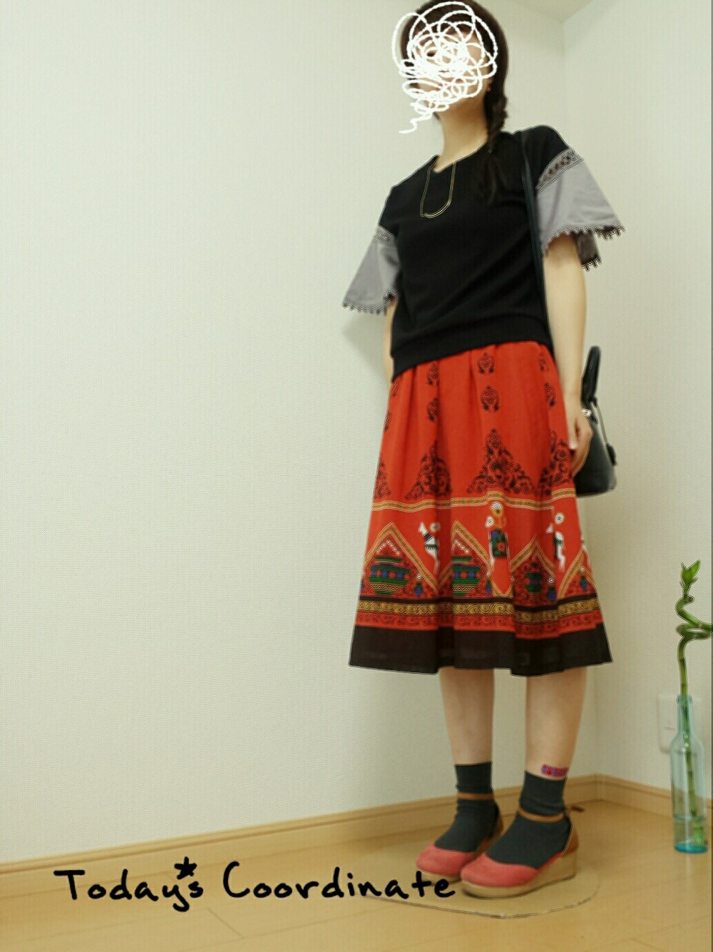 ボヘミアンコーデ。 色はオレンジと黒で。 足のかさぶたいじってたら血が出ちゃったよー。 なのでスパイダーマンの絆創膏を貼ってます(笑)