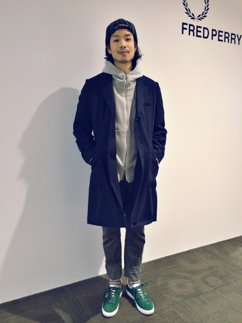 ネイビーチェスターコートにグレーのパーカーをレイヤードしたイマドキスタイル。ウールキャップとスウェードスニーカーで崩しすぎず、リラックスモードに。