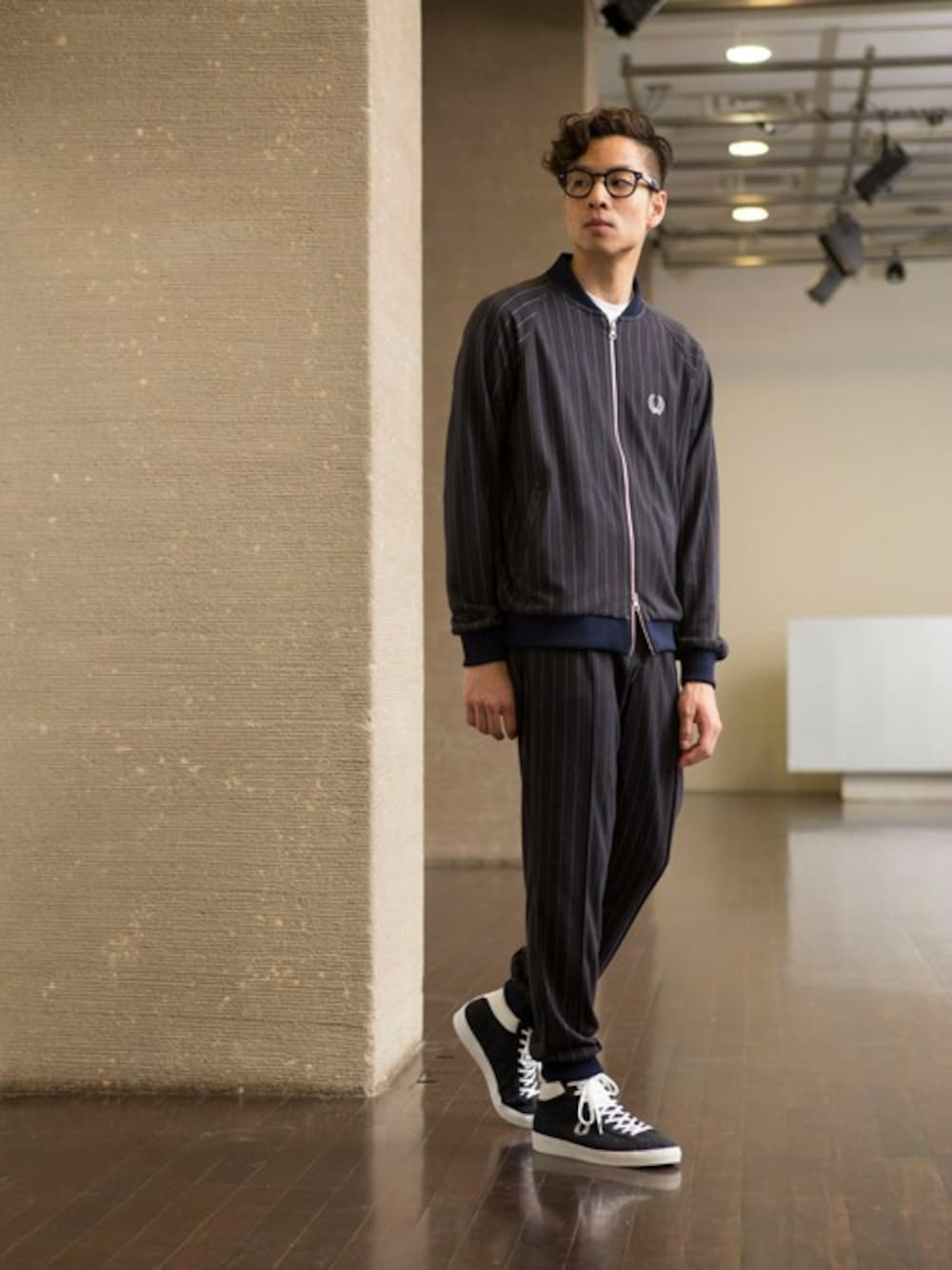 ストライプでスタイリッシュな印象がつくトラックジャケットと、セットアップのリブパンツ。ミッドカットスニーカーでトレンド感あるスポーツMIX。