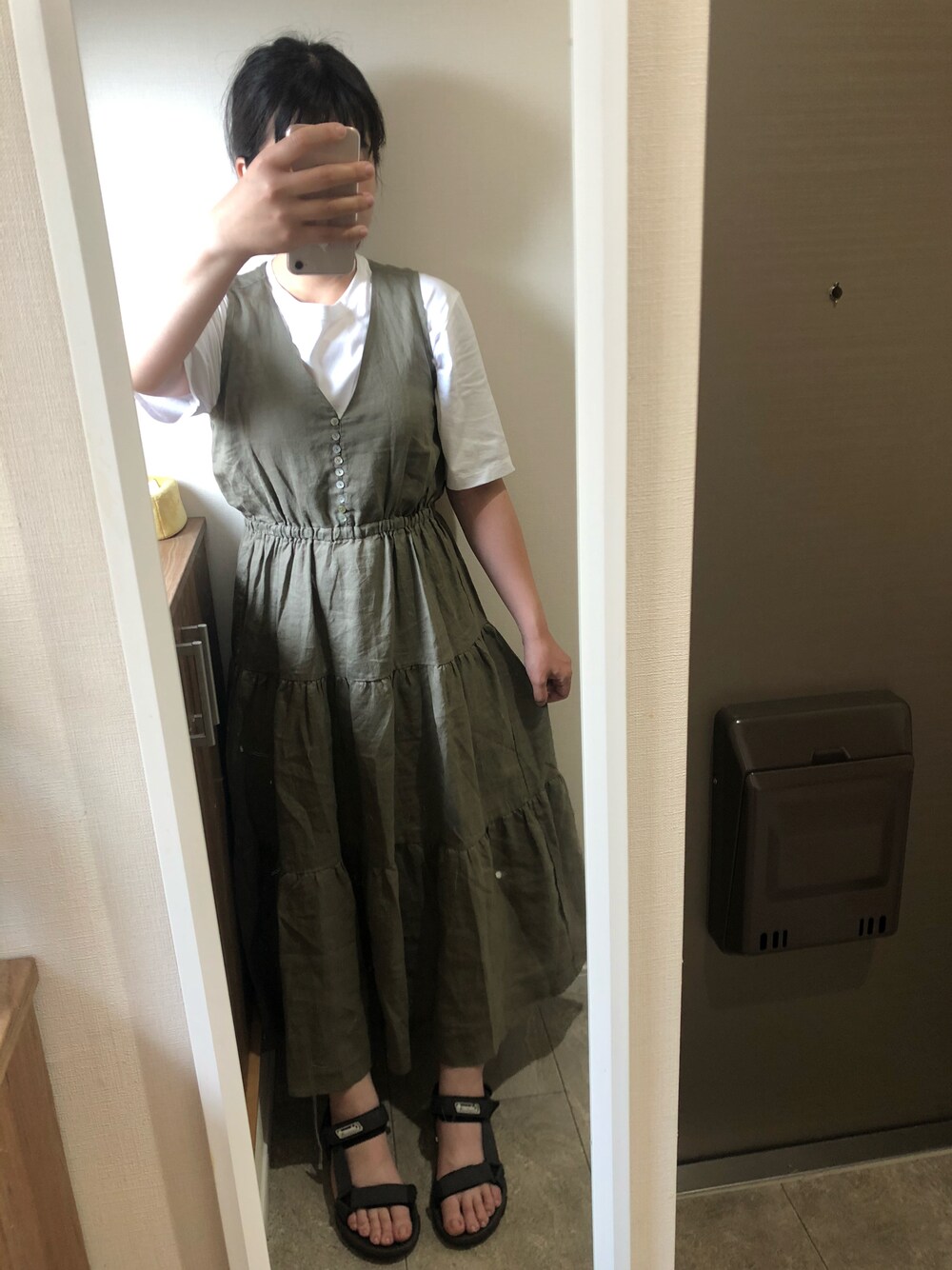 初ティアードワンピース。 色味もあるけど甘すぎないところが良い◎ Tシャツ、ブラウス、タートルネック…レイヤードできるので冬以外は着れる。 素材は麻100%で汗をかいても肌に張り付かないし、これはチクチクしない。 最高!!!