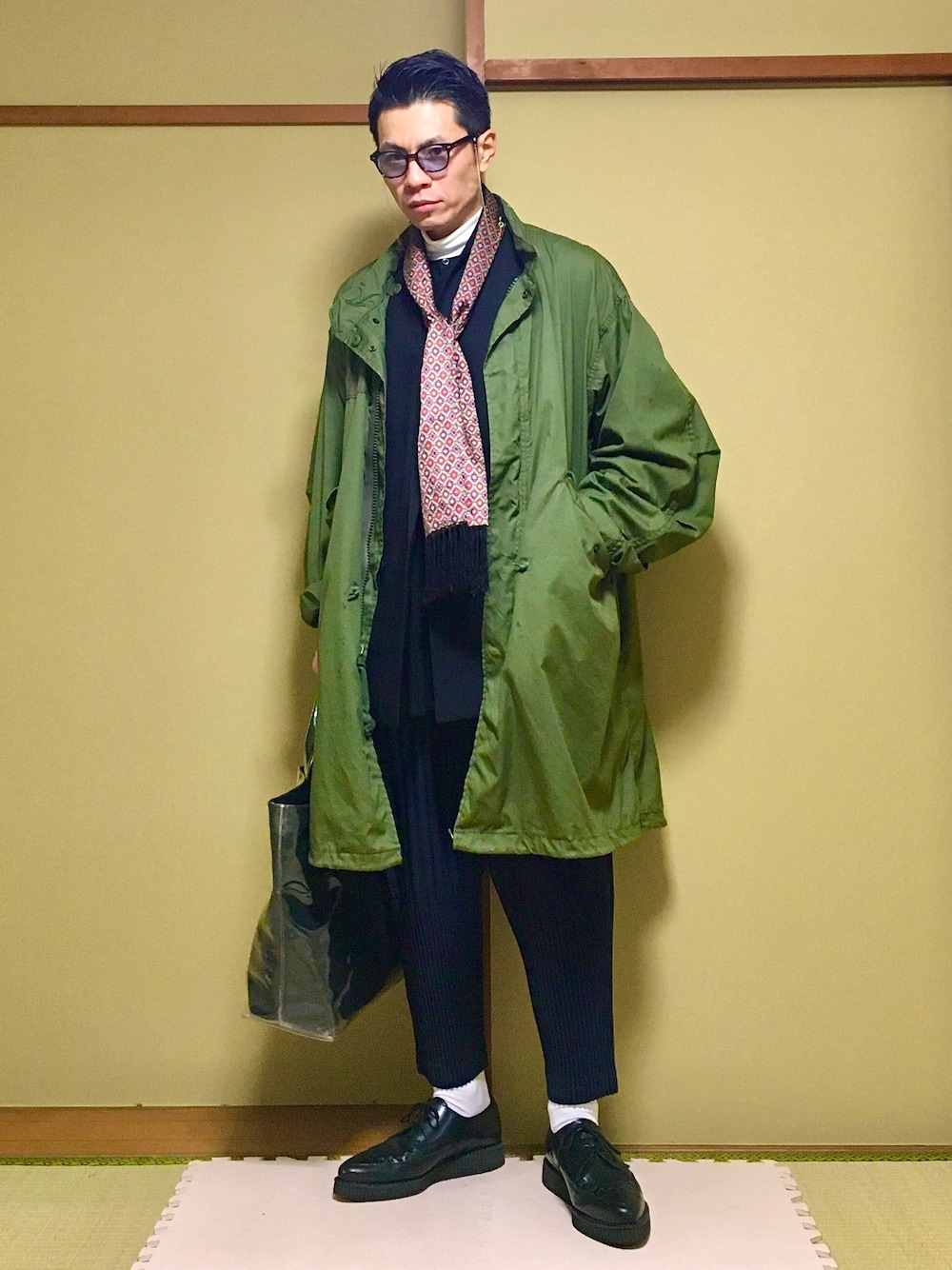 M65 モッズコート着用 土臭いミリタリーアイテムにストールを合わせたスタイルです☺️