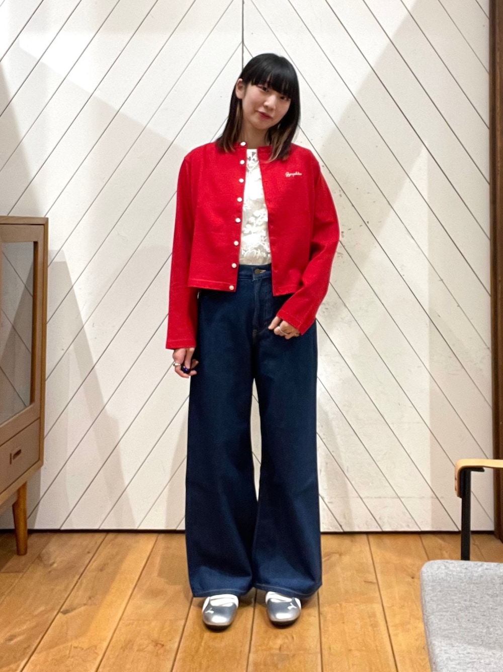 花柄レースのタンクトップにコンパクトなカーディガンを合わせました。インナーをドットやボーダーに変えても可愛く着れそうです。