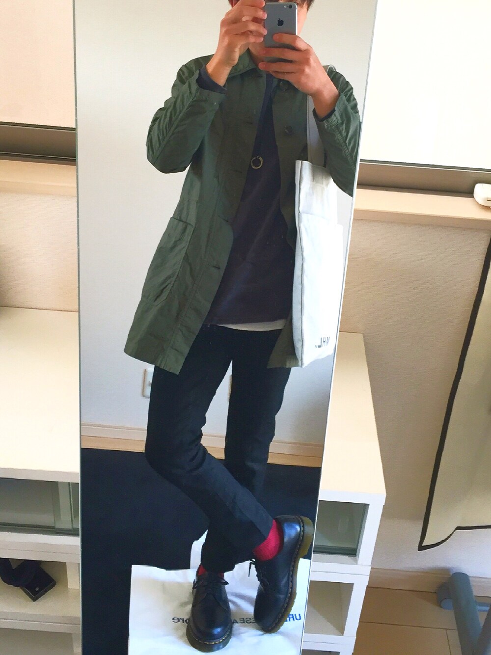 ステンカラーコートのカーキーと靴下の赤色でカジュアルをプラスして見ました。 サイズ アウター⇨S トップス⇨S パンツ⇨1 ドクターマーチン⇨7 いいね、セーブ、フォローお願いします😍