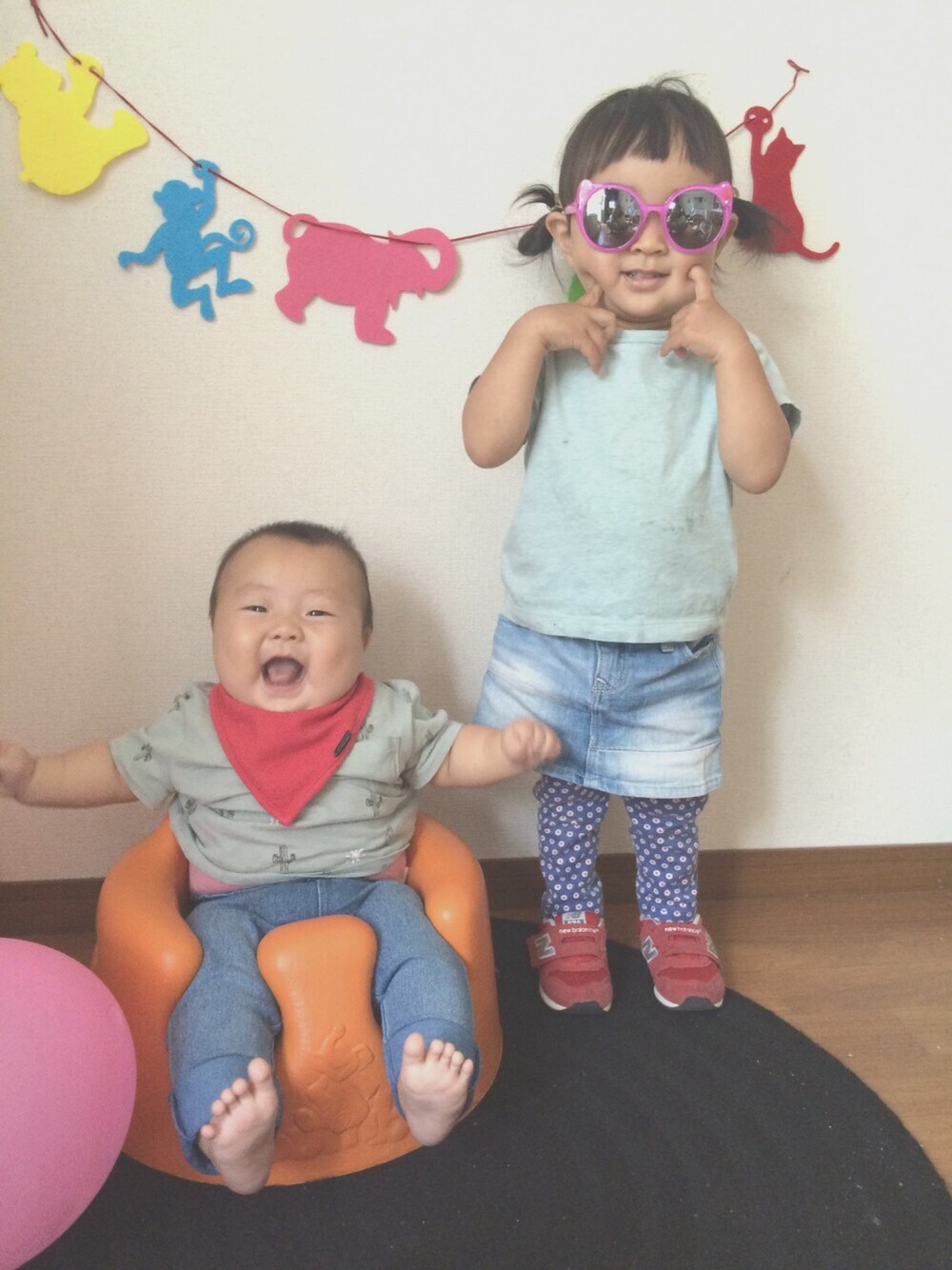 カラーリンクコーデ☺︎ 弟はおでぶが半端ないので、お姉ちゃんと同じ80センチのお洋服です☆