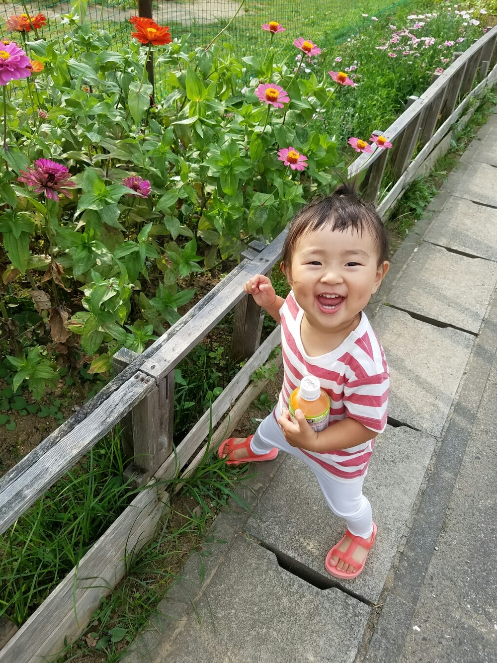 見に来て頂きありがとうございます☺ 日中暑すぎて夕方のお散歩へ♥今日はパパchoiceの楳図さんスタイルで♥ぐわし お花かわいいー🌻って 母にとってはあなたの笑顔が最高にかわいいわよ😘