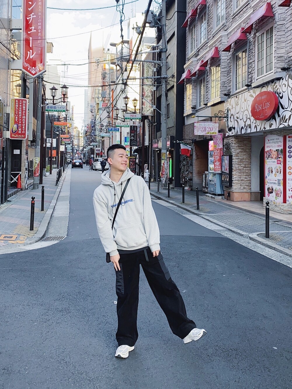 グレー系のパーカーを着用したメンズの冬コーディネートの1枚目の写真