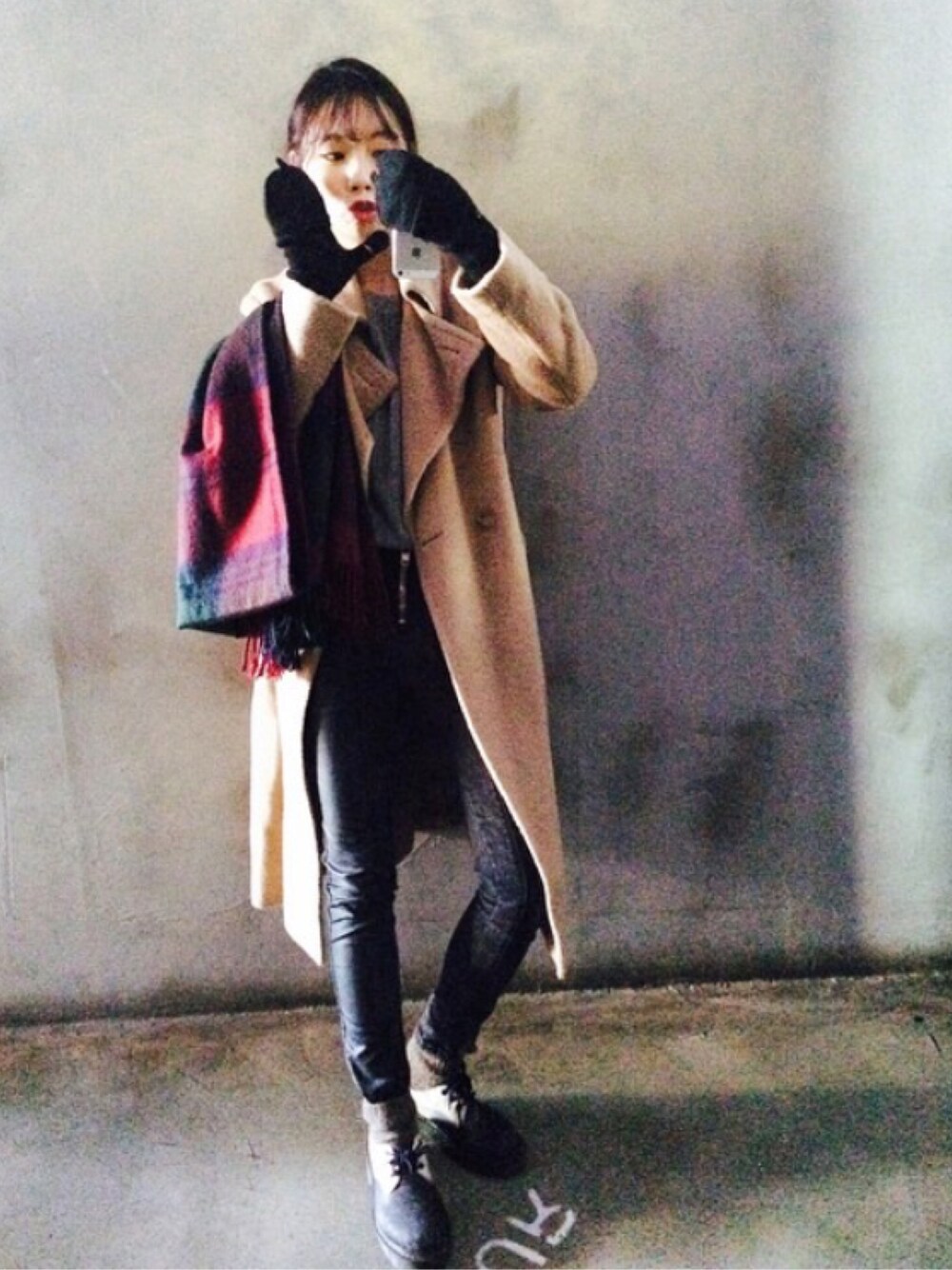 ベージュのロングコートとチェックのマフラーがポイントになりますー!こんな風にコーディネートしたら、絶対寒くないでしょう(笑)
