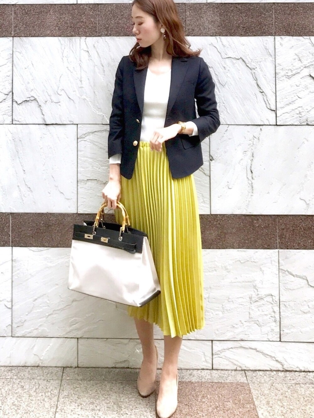 見ていただきありがとうございます😊 社内打ち合わせの日のお仕事コーデ。 金ボタンの紺ブレはusedで購入したものですが、黒ジャケよりコンサバになりすぎず長年重宝しています🙏 おおぶりのピアスを合わせればさらに脱コンサバ効果⤴️✨ インスタ→@soliabe5787