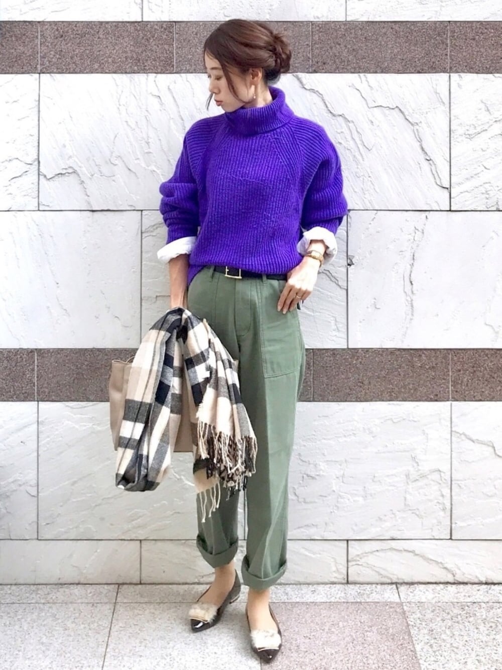 一日内勤の日のお仕事コーデ。 鮮やかなパープルのニット💜 シャツをインして落ち着いたバッグとストール、華奢なアクセサリーを合わせ、スッキリまとめ髪にしてお仕事仕様に。 トップス、ボトムスともボリュームのあるデザインなので、手首と足首を見せて着太り防止💪 インスタ→@soliabe5787