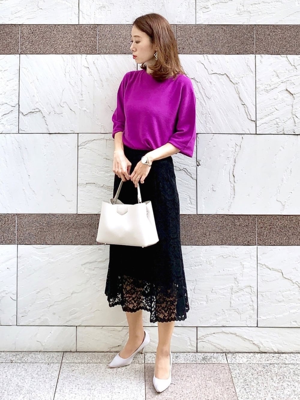 お仕事コーデ 打合せの日。鮮やかな🍇色のニットはやや赤寄りの色なので、イエベの私の肌に馴染んでいい感じ😆 今年流行のブラウンとも相性が良さそうなので早く合わせてみたいな~❤️ インスタ→@soliabe5787