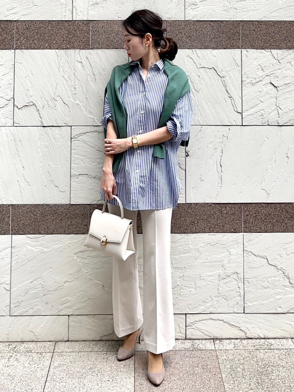 お仕事コーデ 今年よく見るブルーのストライプシャツ×グリーンニット。 フレアパンツの足元はブーツ、スニーカー色々見るけど個人的にはヒール合わせが好みです☺️ インスタ→@soliabe5787