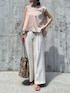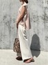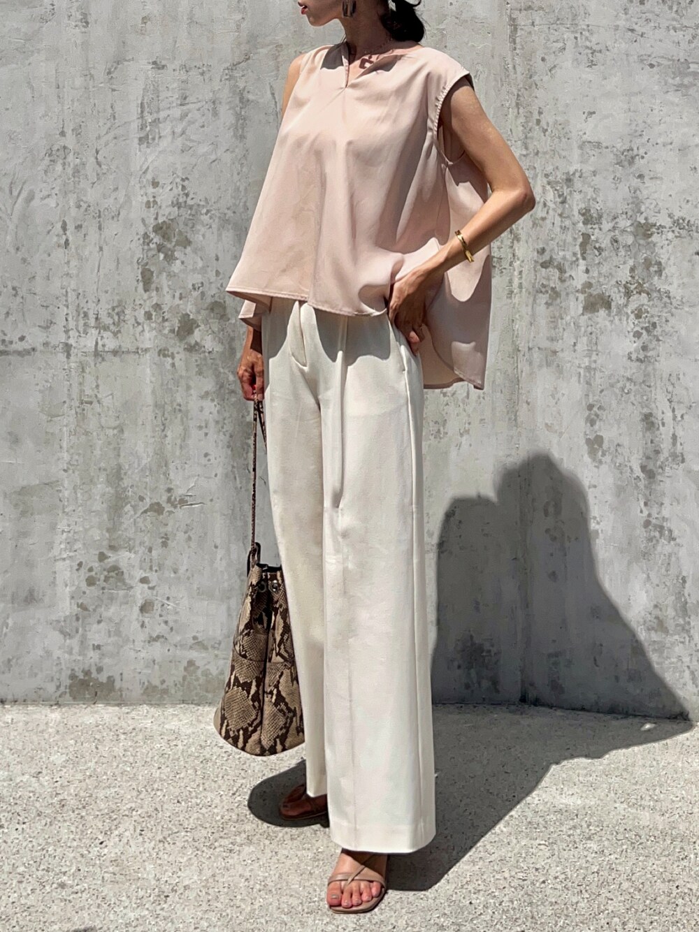 出社日オフィスカジュアル コーデ お気に入りキーネック ブラウス の 着回し ☝️✨ ホワイトのワイドパンツ 合わせで 爽やかな大人の淡色コーデ に。 ノースリーブブラウス なのでフルレングスの ワイドパンツでもコーデが重くなりません。 ボンヤリした印象にならないように 👜にパイソン柄 をもってきて。 足元はパンプスでなくストリングサンダル に するとカッチリしすぎずキレイめなコーデに。 インスタ→@soliabe5787