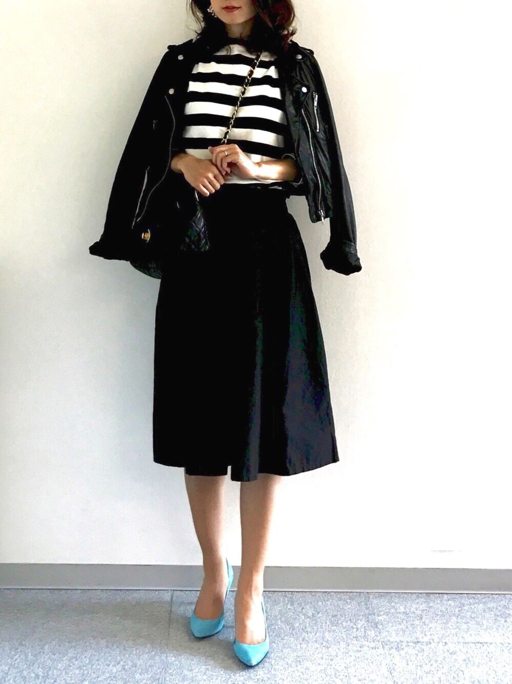 見ていただきありがとうございます😊 一日内勤の日のお仕事コーデ。 モノトーンに鮮やかなカラーパンプス1点投入💪 そろそろライダースすら暑いですね💦 インスタ→@soliabe5787