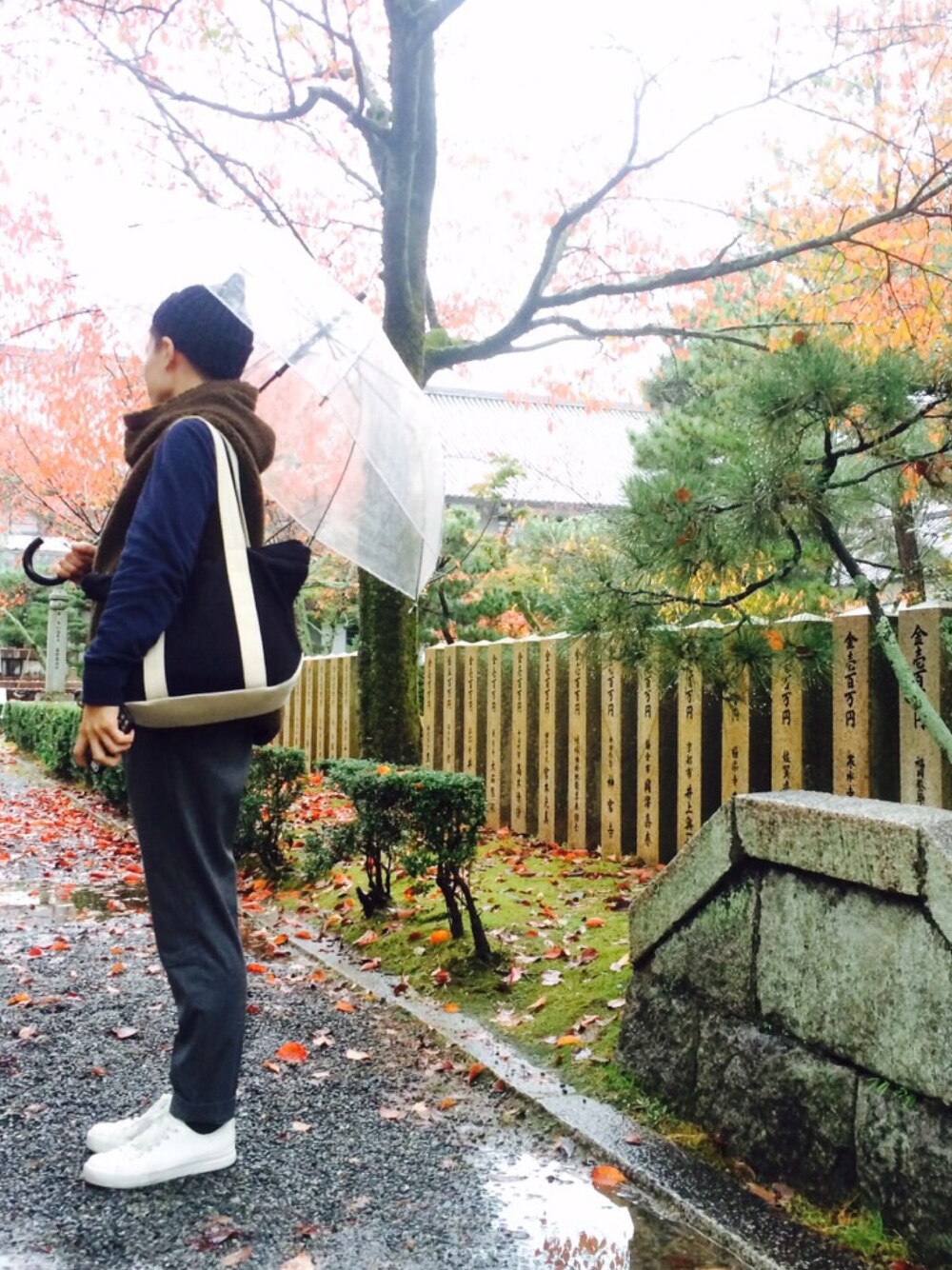 初投稿です。 . 雨の日の京都。 紅葉の秋。 日本らしさが更に増してた気がします。 何よりもマイナスイオン沢山でした。 . 興奮し過ぎて、水溜りに思いっきり突っ込みました。 そして真っ白な靴に黒ずみが。 足元注意な1日でした。 🎩 #leuchtfeuuer 👕 #coen #gymphlex 👖 #morri&sons 👟 #靴下屋 #無印良品 👜 #無印良品