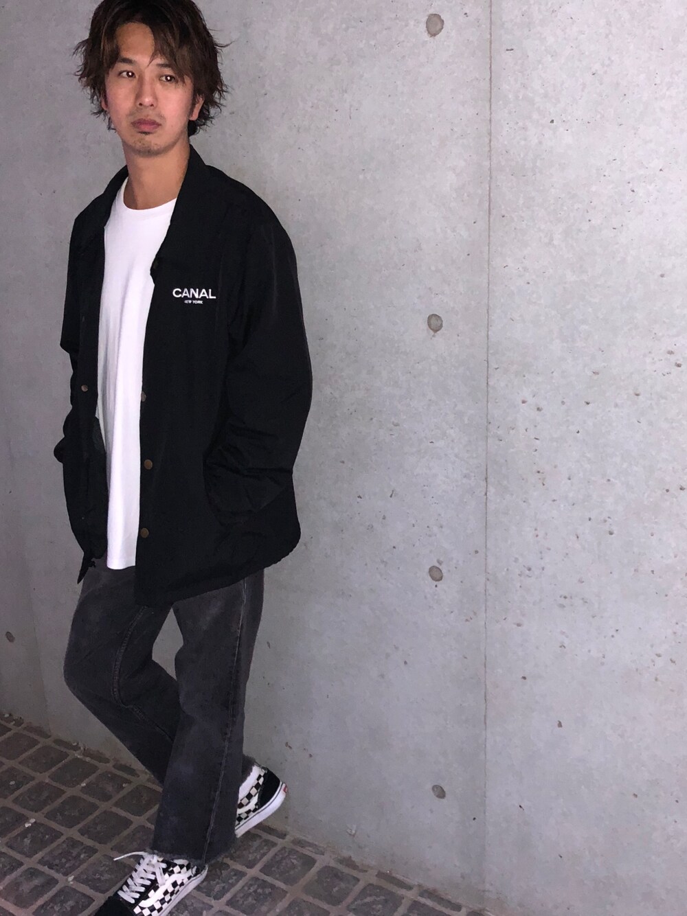 黒のコーチジャケットでスケーター感を出したスタイル! 最近、寒くなってきたので羽織る物があるとお洒落度がアップすると思います!
