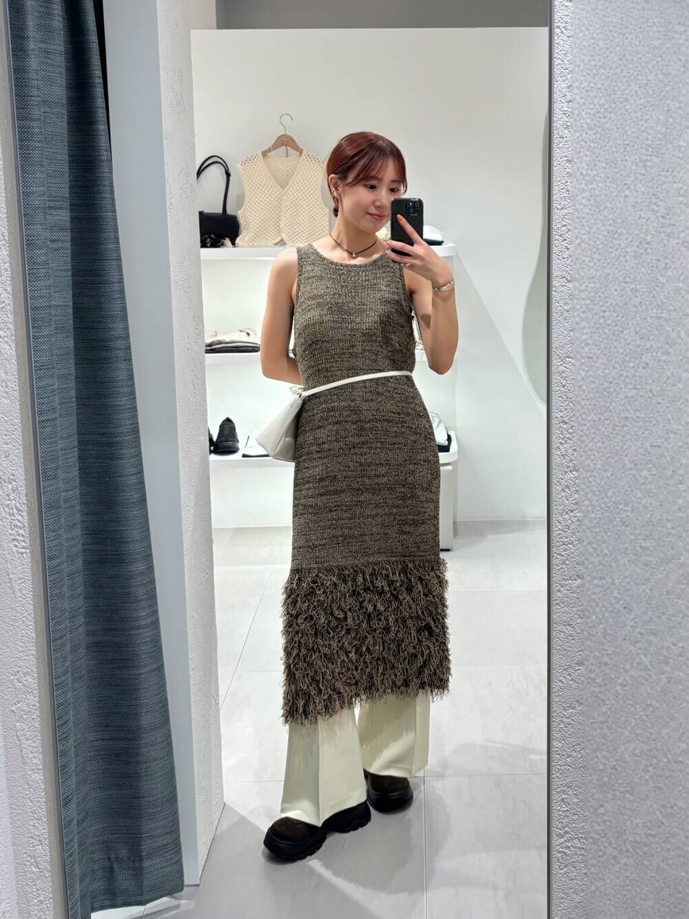 ループフリンジニットワンピースはボトムスと合わせることで体のラインを気にせずに着ていただけます☺️ 高身長の方はボトムスとレイヤードするのがおすすめです〜