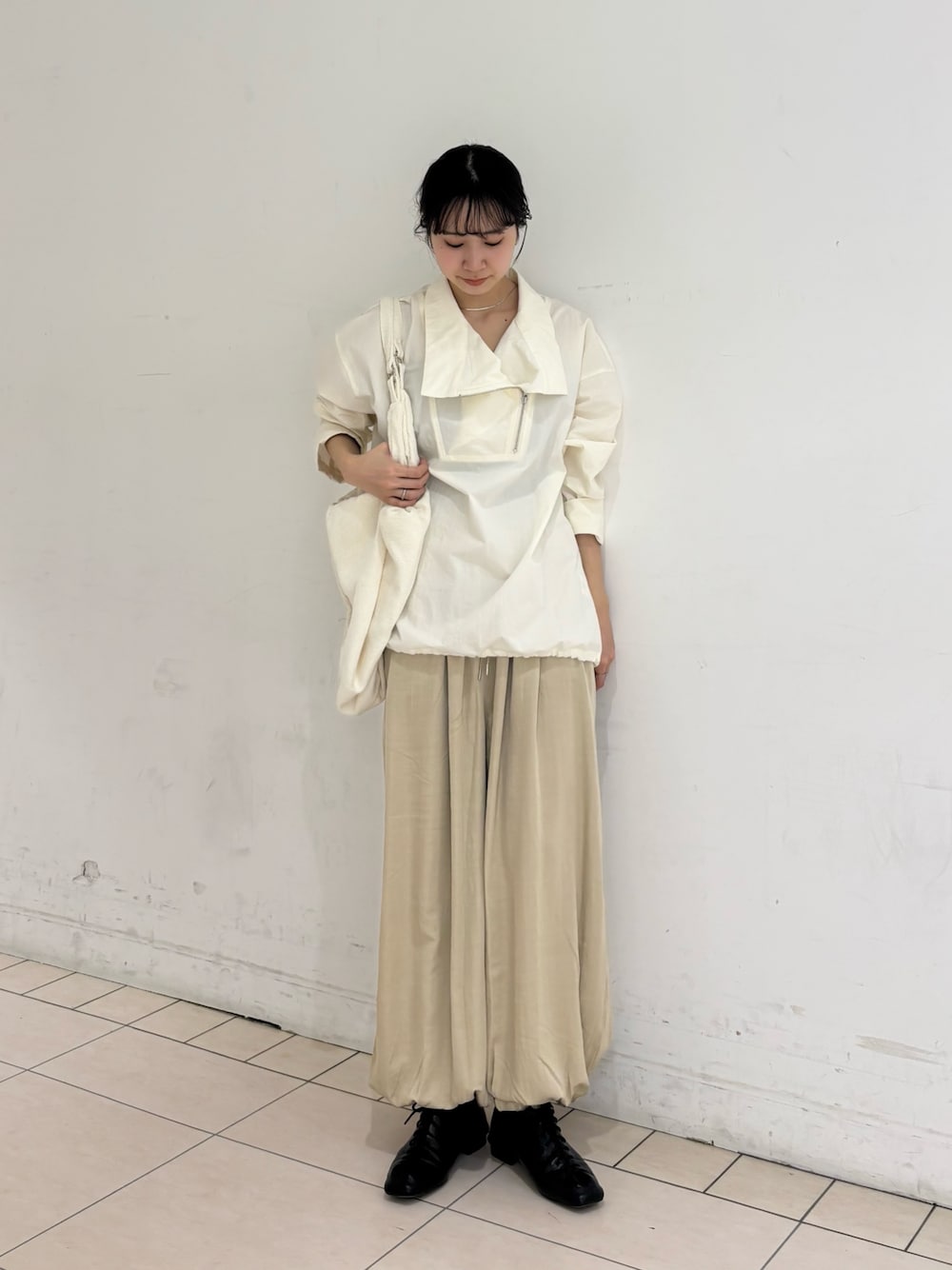 フロントZIPアノラックはとても軽い着心地でストレスなく着ていただけます! サテンバルーンパンツもウエスト部分がオールゴムなのでとても楽です〜✨ 身長167cm イエベ 骨格ウェーブ