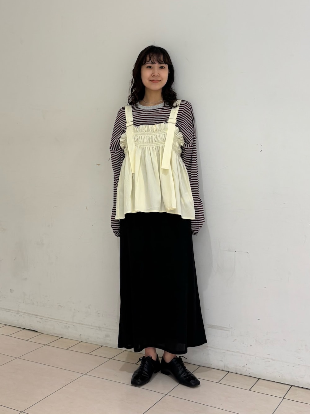 大人気のフリルギャザービスチェ! インナー次第では夏まで着れるのが嬉しいポイント! 切り返しの位置が高いのでスタイルアップも叶います✨ 身長167cm イエベ 骨格ウェーブ