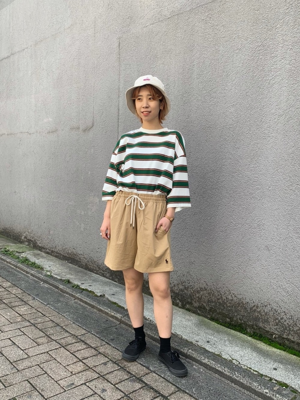 ●マルチボーダービッグTシャツ サイズ感:ゆったりめ。 着心地:柔らかくサラッとしている。 ●SWIM SHORTS サイズ感:紐調節でウエストはぴったりで履ける。 着心地:ゆったり動きやすくて、少しシャリ感のある素材で涼しい。 ●WORK LOGO BUCKET HAT ポップでかわいいロゴがアクセント。女性の方でも合わせやすいサイズ感。
