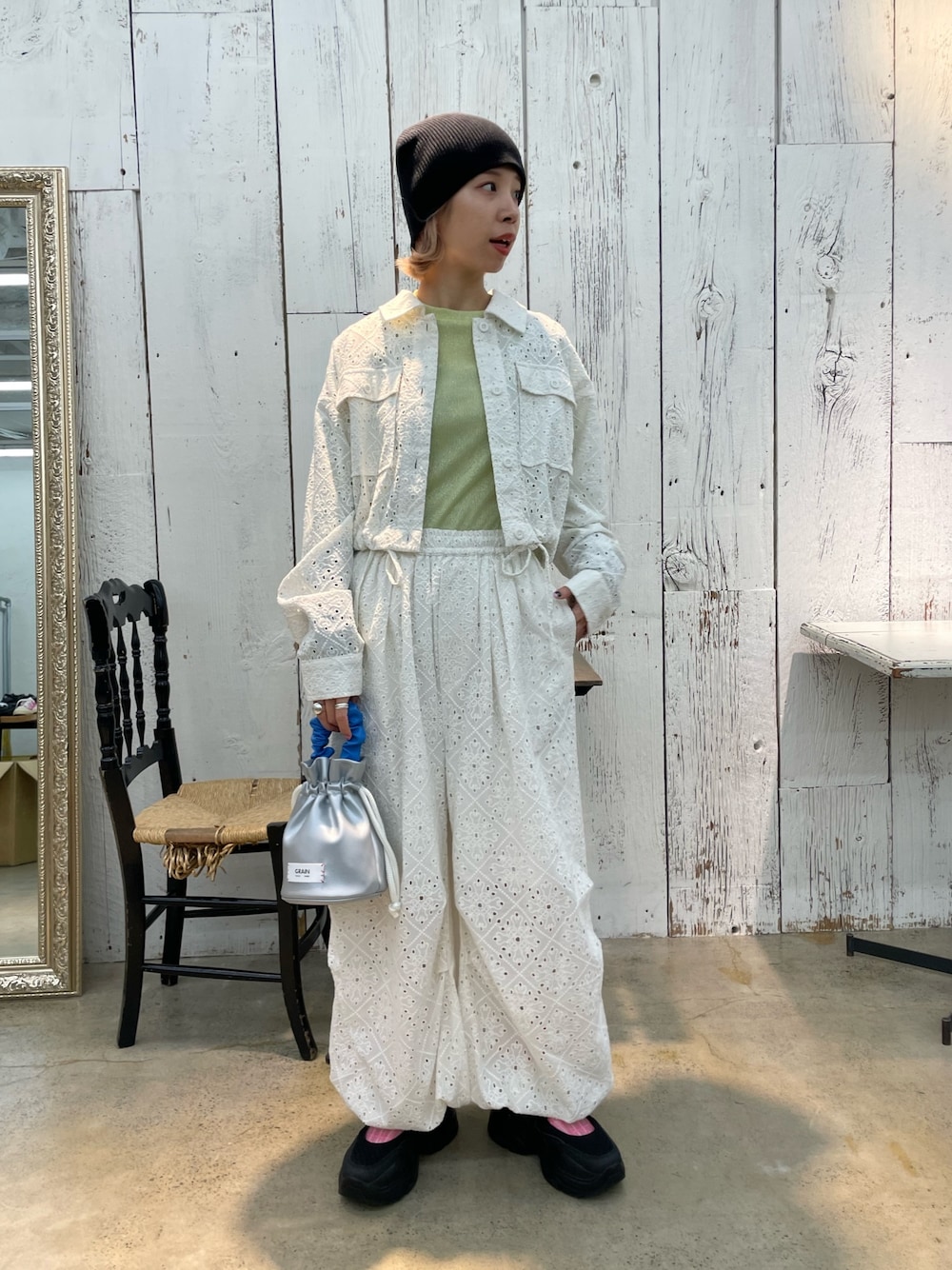 ●レースショート丈2ポケットシャツ レース素材なので軽くて、日差しよけなどにさっと羽織れて便利のショートシャツ。 カジュアルなディティールですが、レースの素材の甘さがバランス良いです! ●レースパラシュートパンツ ゆったり楽ちんかつ、レース素材が他になくておしゃれ見え抜群はパラシュートパンツ◎ クロップド丈のアイテムなどに掛け合わせて使うとスタイルバランスが良く見えますよ!