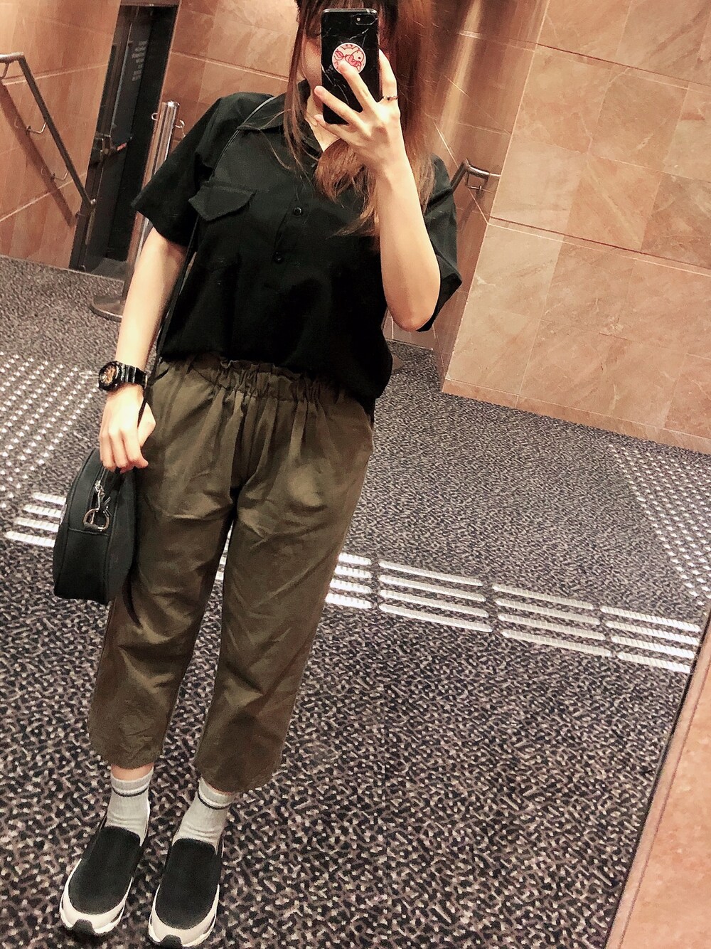 ブラック系のポロシャツを着用したレディースの夏コーディネートの1枚目の写真