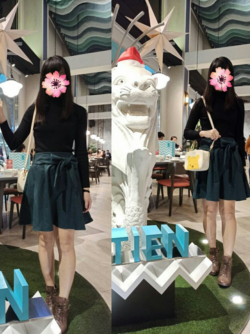 🌻今天是走低調內斂的暗色系穿搭 🌻下身是沉穩的墨綠色,短裙是偏厚款,冬天穿著剛剛好 🌻因為下身是穿短裙,所以上身更要注意保暖,而選擇黑色坑條針織毛衣,高領讓你從脖子暖到腳~~ 🌻小方包是最近新獲得的禮物🎀小熊維尼超級可愛!而且容量也頗大喔!可以放得下手機、錢包和鏡子、唇膏等等小物都沒問題 #ootd #大學生 #小熊維尼 #穿搭分享 #今日のコーデ #冬コーデ #冬季穿搭 #putien #墨綠色