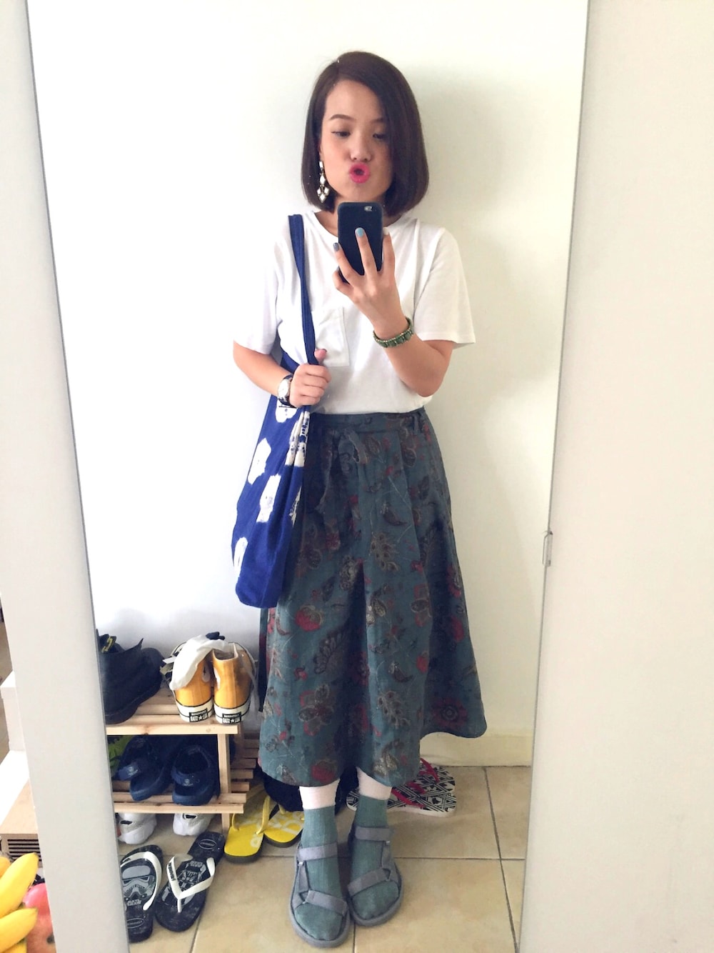 White pocket tee Dark green floral pattern skirts Teva x Beauty & youth sandals Navy Timex watch