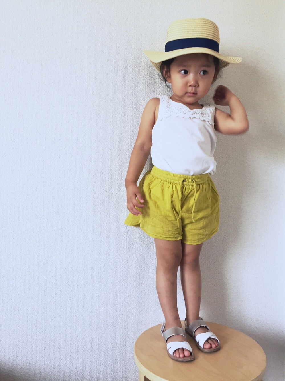 ベージュ系のハットを着用したキッズの夏コーディネートの1枚目の写真