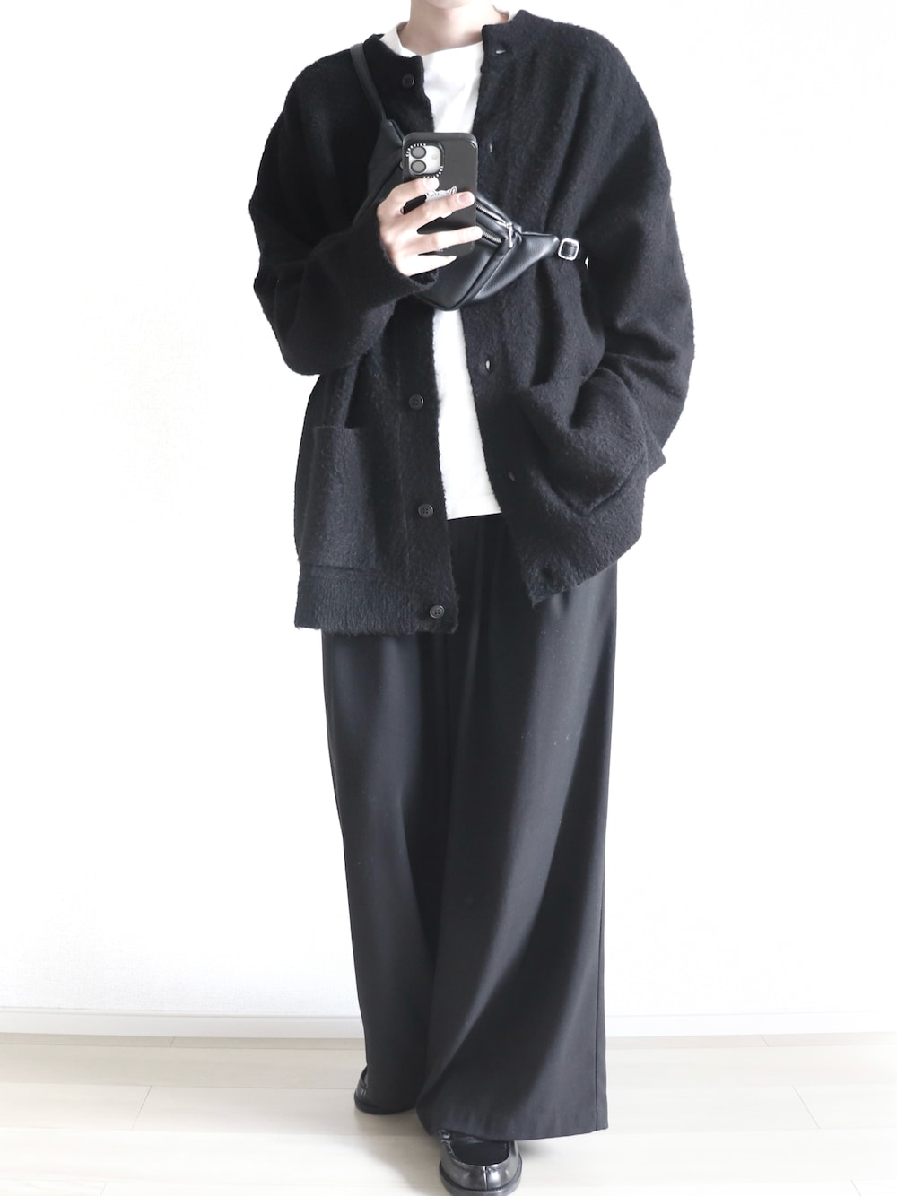 . . いつも閲覧いただきありがとうございます!! . . クルーネックのカーディガンを使ったモノトーンなゆるコーデです . . ふわっとした毛足のある黒カーデが柔らかい雰囲気を作ってて、色味をモノトーンに統一して洗練されて見えます . . 縦のラインもキレイに出ていて、スタイリッシュに見えます . .