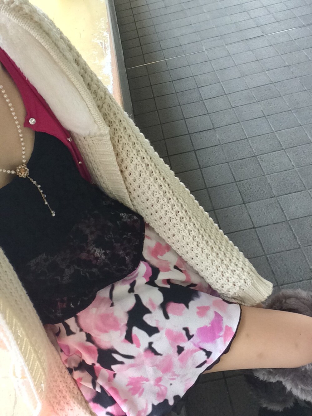 ピンクと黒のコーデ! 女性らしさを意識しましたー! インナー、スカートはriendaです