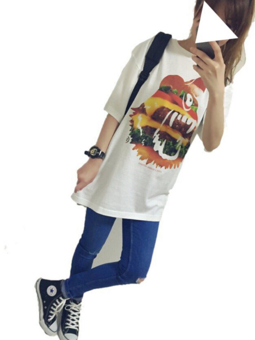 ロリクレの新しいTシャツ♪ ハンバーガー柄です♡ ZARAのクラッシュスキニーはストレッチが効いていて履きやすいです! コンバース大好き(^^)