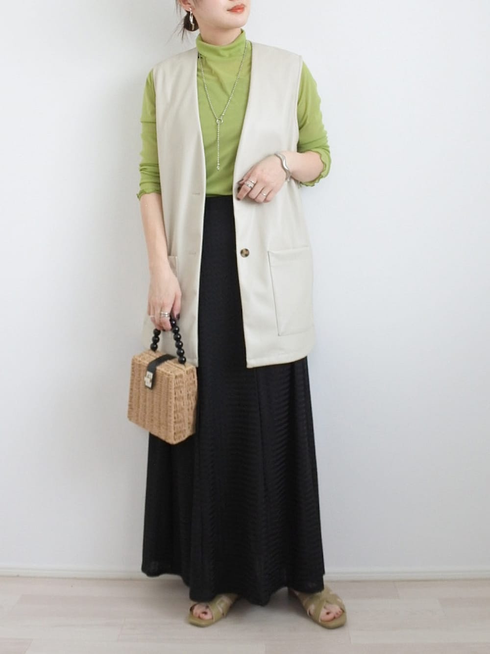 𝕐𝕌𝕂𝕚のかごバッグ「ビーズハンドル2wayかごバッグ」を使ったコーディネート