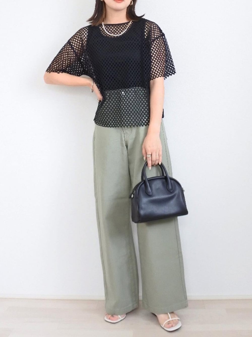 moment +様の メッシュトップス&デニム🌿🖤 主役級のメッシュトップス◎ 取り入れるだけで今年らしいスタイリングに◎ カラーデニムはハイウエストで脚長効果抜群🫶🏻 オールシーズン着用できるコットン100%です! どちらもSALE中です✨