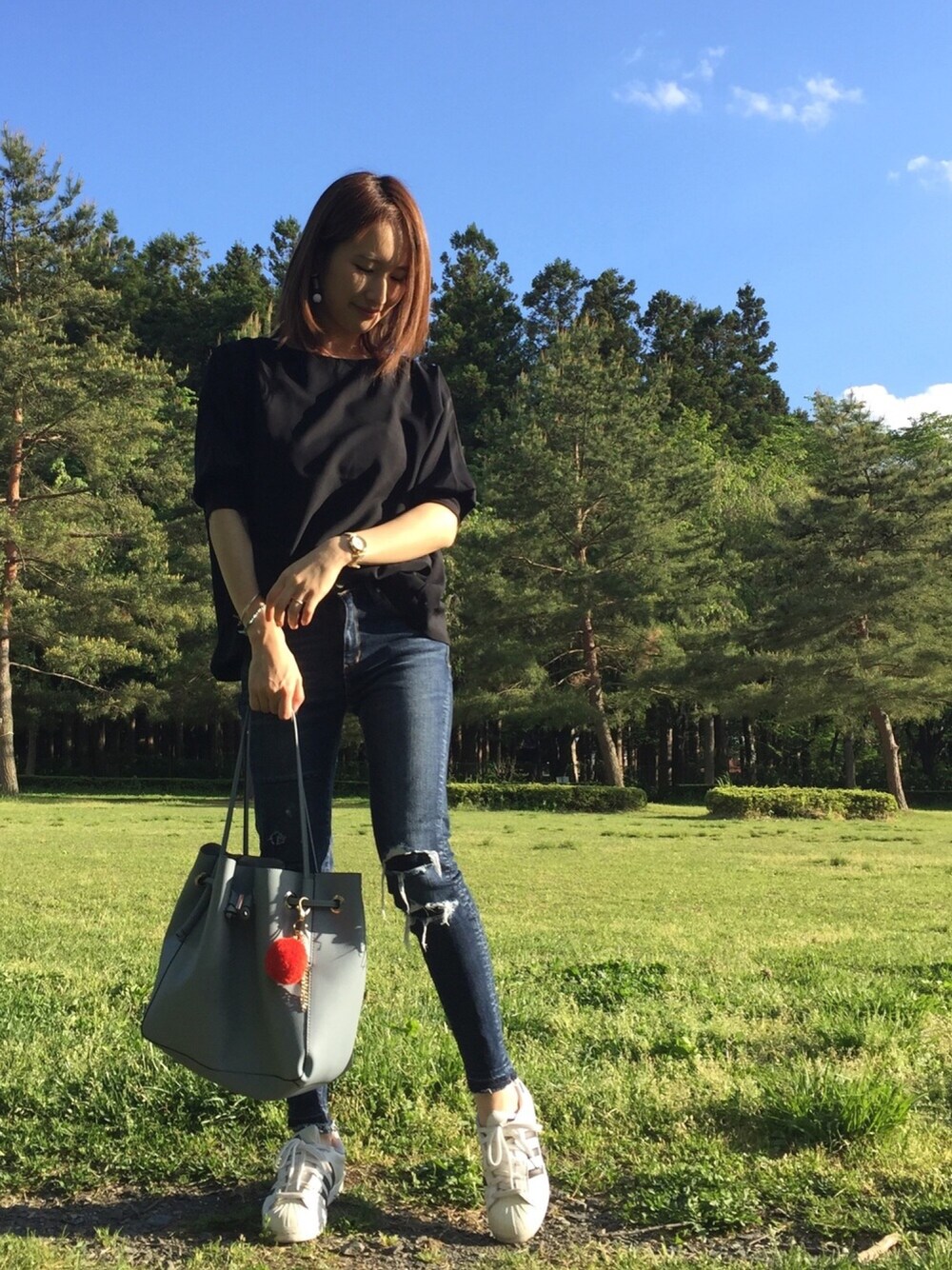 こんばんは🌚✨✨ 以前GUのプレゼント企画で頂いたトップス🖤 久々に黒着たらなんかワクワク💖💖 シンプルトップスなのでダメージリペアデニムを👖☀️ 公園へ行ったのでスニーカーを合わせました👟♪ 見て頂きありがとうございます😊♡ Instagram✈︎✈︎✈︎yktaaaan3jsb