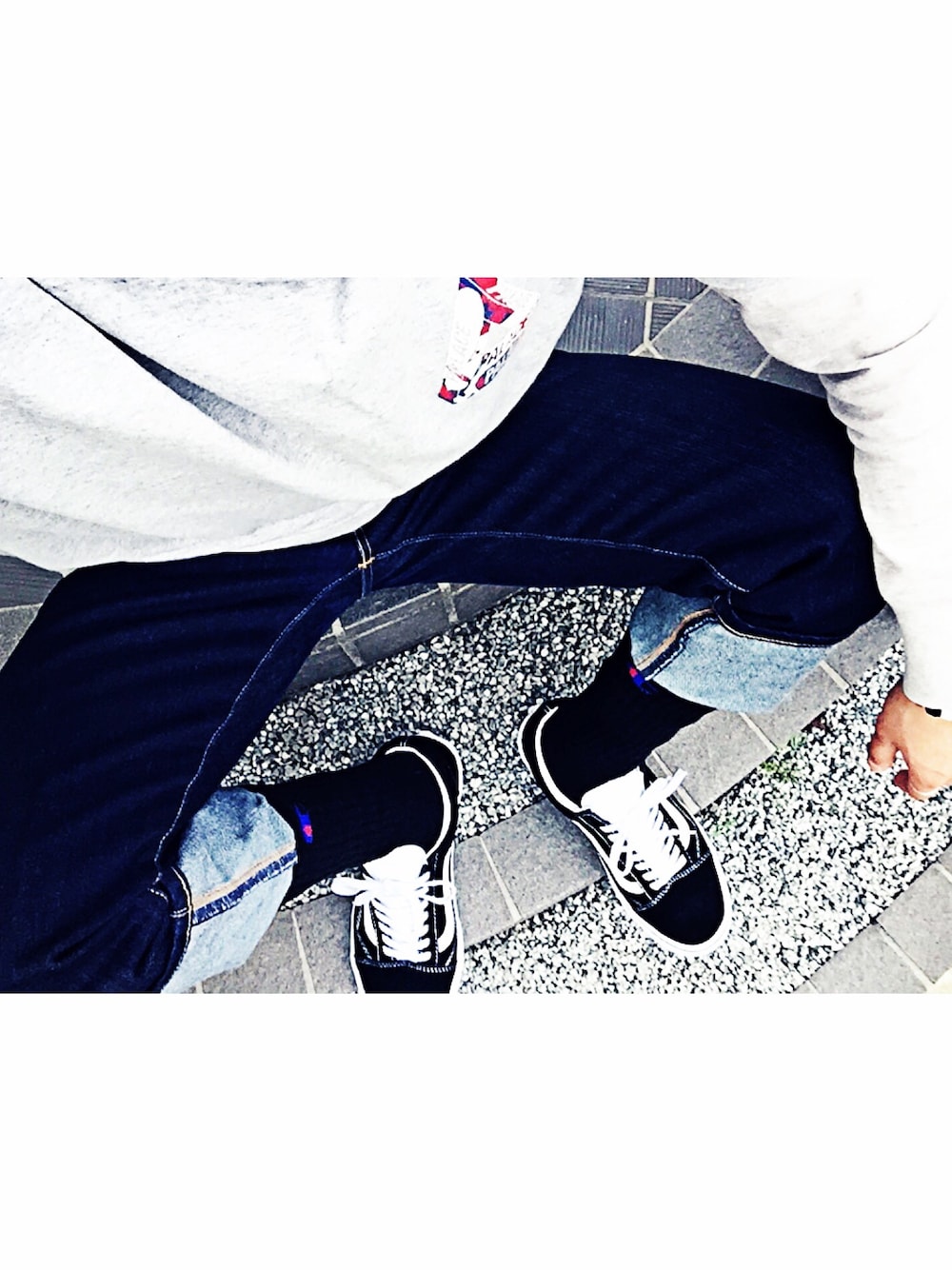 デニムを太めでロールアップしてソックスのチャンピオンのマークを見えるように履いてみました! palaceのTシャツの中にパーカーを着てみました!