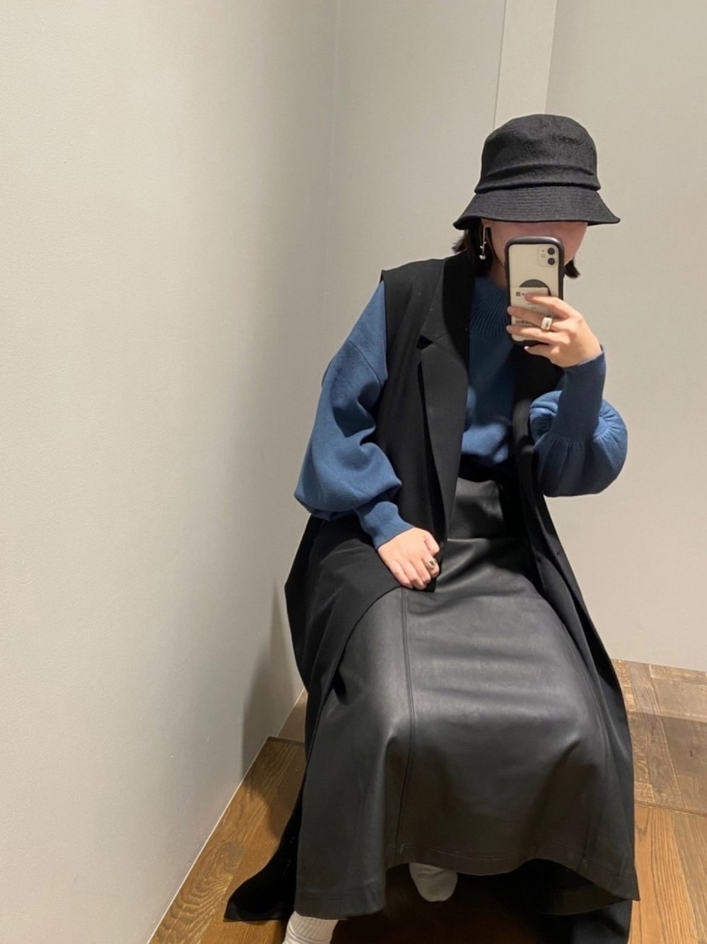綺麗めコーデ! 袖ボリュームにスカートでかわいらしく、 でもテーラーロングベスト着ると 一気にモードな感じになって良い◎ オールブラックに差し色一つがお気に入り〜