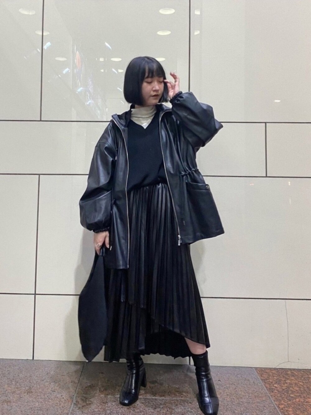 顔が死んでる瞬間ですが 大好きなオールブラックです✌︎ レザーのアイテムで合わせて ちょっとセットアップっぽい雰囲気に! 最近寒いからもうタートル着ちゃってる、、