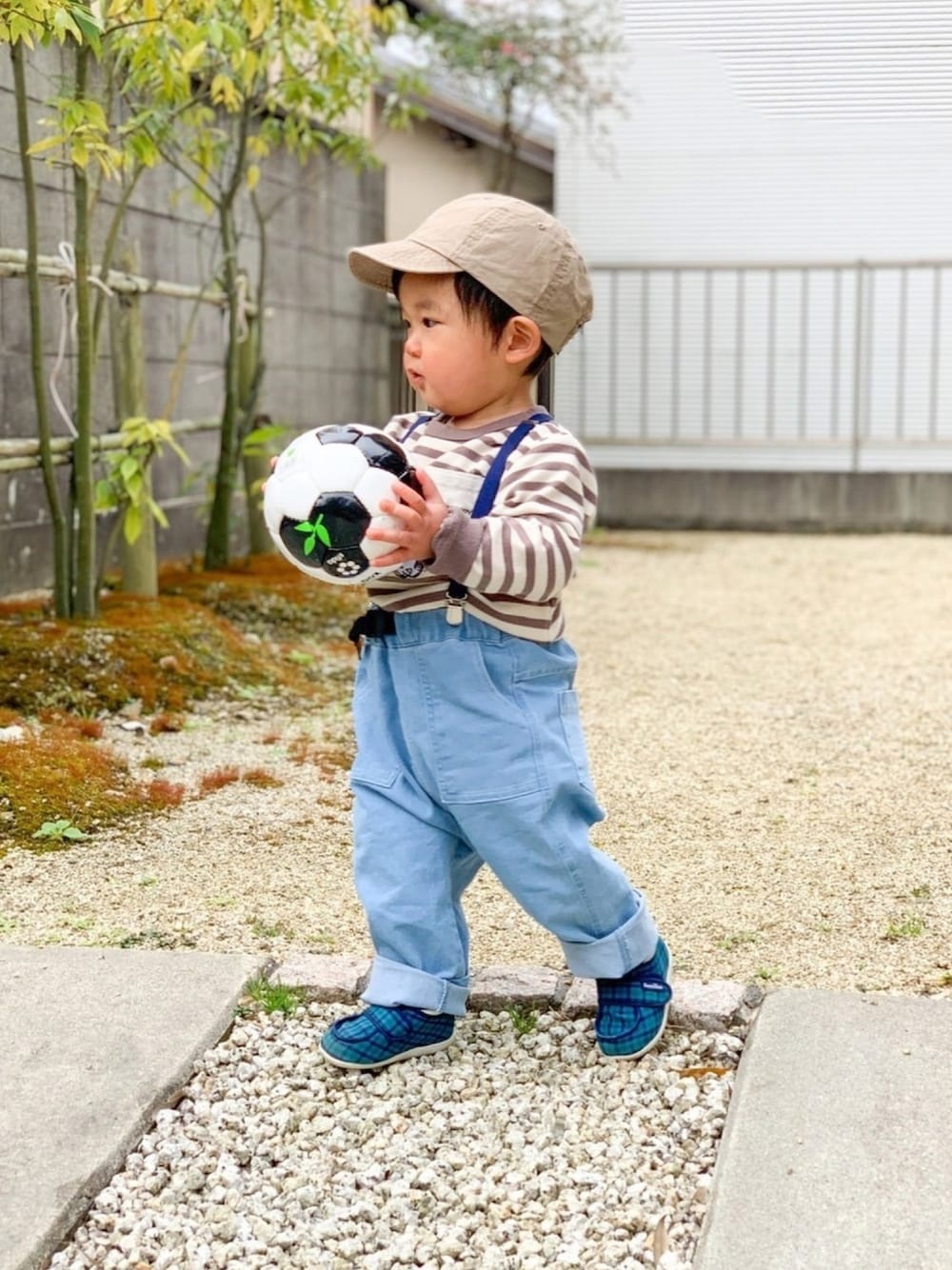 ❤︎ご覧頂きありがとうございます❤︎ ♡+コメントフォローどれもとてもうれしいです💓 ありがとうございます😊 本日のコーデタイトル 『ウエストが大きくてズボンが下がってくるのでやってみたサスペンダーコーデ 〜お気に入りのサッカーボールと共に〜』 全くオシャレ感ゼロのタイトルですみません😂 1歳半になって少しずつ自我が強くなってきたyutoさん。 最近は帽子被るのを全力で嫌がり、被らせると泣き叫びます。 ですが母は無理やり被せます🤣 ごめんよ、息子😙 ✈︎✈︎✈︎✈︎✈︎ 1y6m 82㎝ 10.5kg ✈︎✈︎✈︎✈︎✈︎