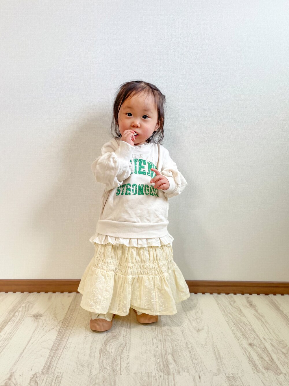 ❤︎ご覧頂きありがとうございます❤︎ ♡+コメントフォローどれもとても嬉しいです💓 ありがとうございます😊 #ロゴスウェット 白のロングスカートがずっと欲しかったママ。 おチビサイズでは中々なくて、そうしたらpetit mainさんの新作で発売されて、すぐポチッとしてたわ。 黒も欲しいとか言ってるんだけど、どうしたらいいかしら。 わたちまだお熱あるから、お熱下がってから考えてほしいわ。 そんな今日はロゴスウェットと合わせた白のワントーンコーデ🤍 女の子らしい色味とシルエットがお気に入り♡♡♡ ✈︎✈︎✈︎✈︎✈︎ 1y2m 73㎝ 9kg ✈︎✈︎✈︎✈︎✈︎