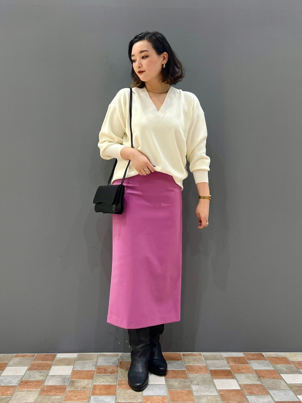 季節の変わり目にもハマりやすい! タイトスカートを使ってコーディネートしてみました。 ピンクをメインにシンプルなVネックで合わせて、 小物はブラックでまとめてみました★ デートコーデや小物を変えればワークスタイルにも◎