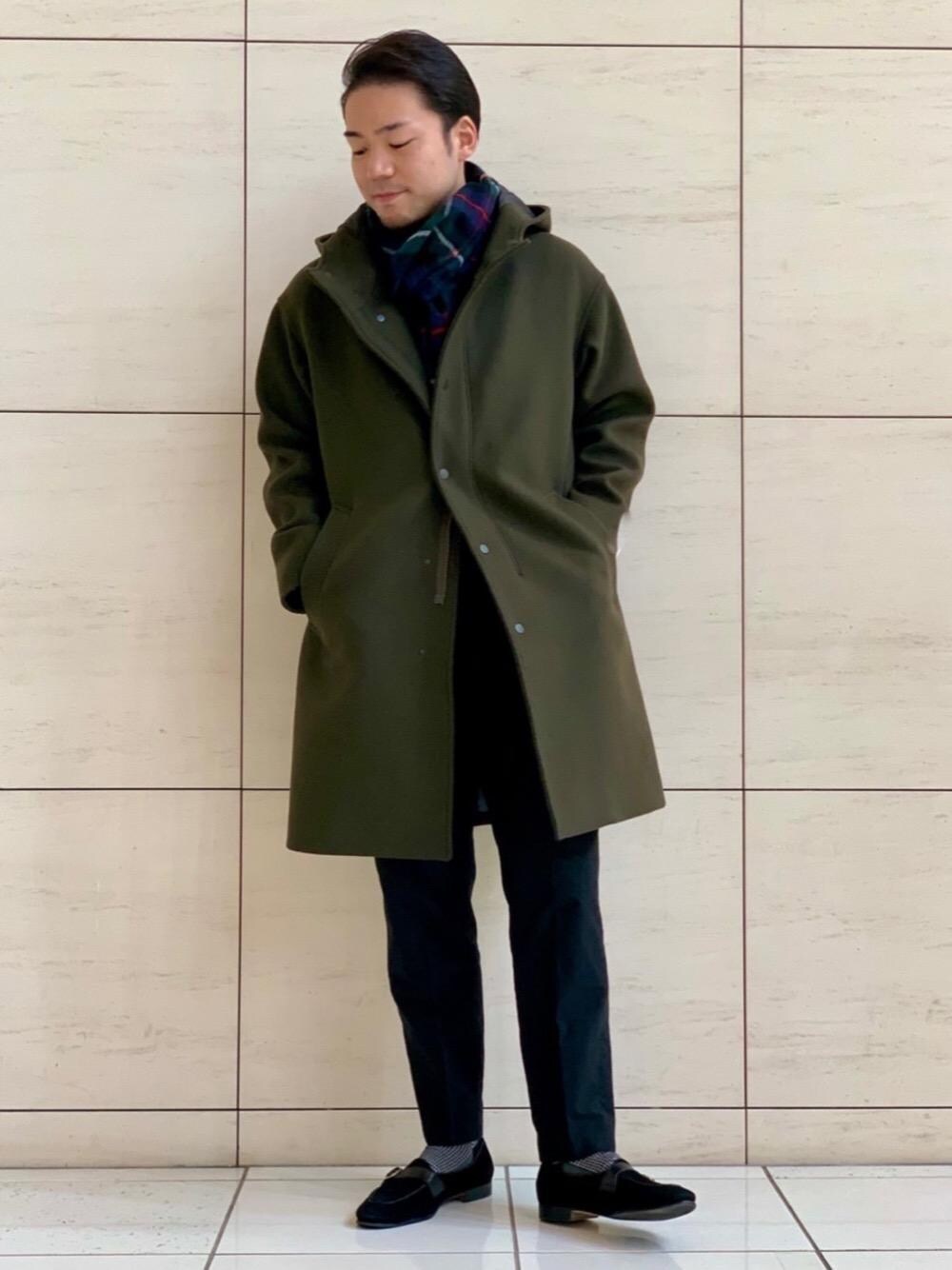 《身長172cm》着用size:coat S/pants S/shoes 7(普段スニーカー26.5cm) 可愛らしくなりがちなフードコートですが、このコートはウエスト周りのドローコードを絞ることでくびれ部分が出来、エレガントな雰囲気に変える事ができます。革靴を合わせるスタイリングもおすすめです。