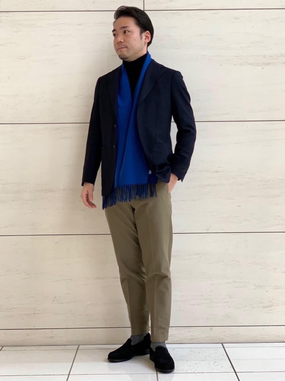 《身長172cm》着用size:jkt 44/pants S/knit S/shoes 7 色鮮やかなマフラーを差し色で使ったスタイリングです。暗めなトーンが多いビジネススタイルも顔周りが明るく見えます。