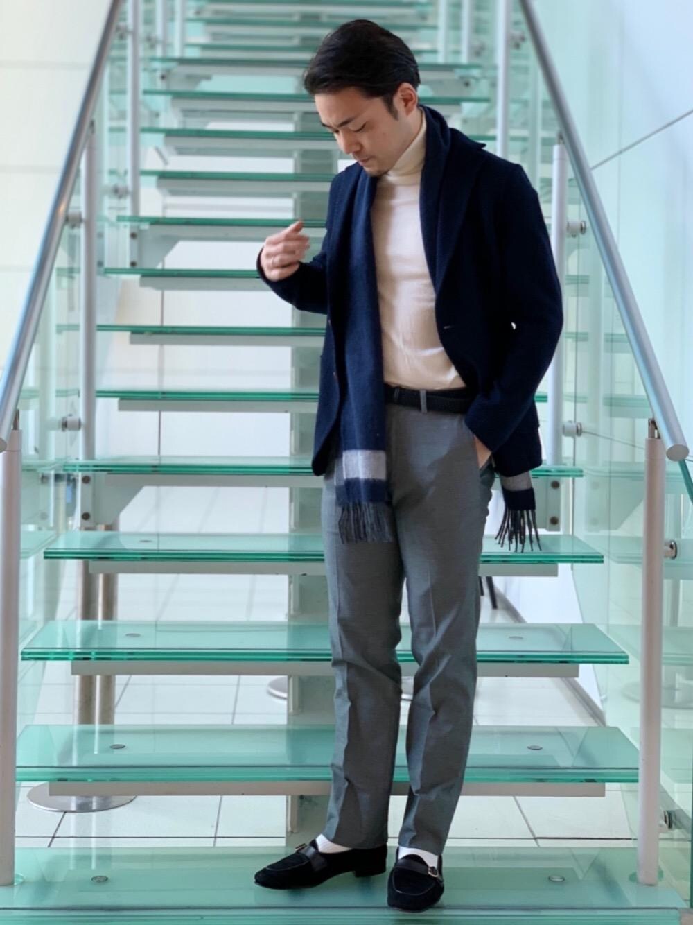 《身長172cm》着用size:jkt 44/pants S/knit S 素材がカジュアルな為、オンオフどちらでも使いやすいジャケットスタイルです。なるべく使う色を絞ってまとまりのあるスタイリングに仕上げています。