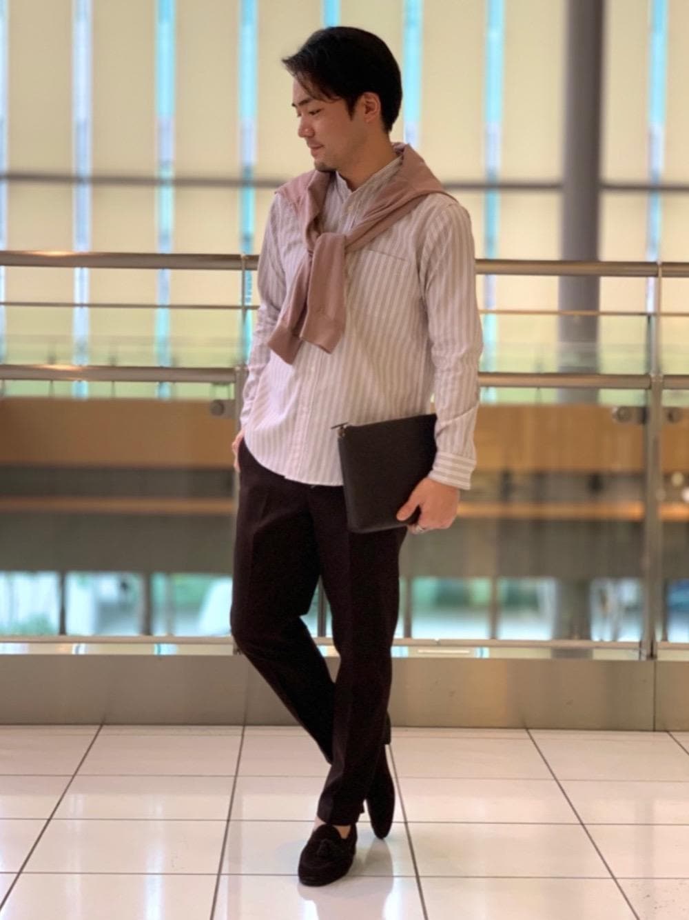 《身長172cm》着用size:shirt S/pants S/knit S/shoes 40 春を意識して薄めのブラウンをメインにしたスタイリングです。爽やかなピンクニットをトッピング。