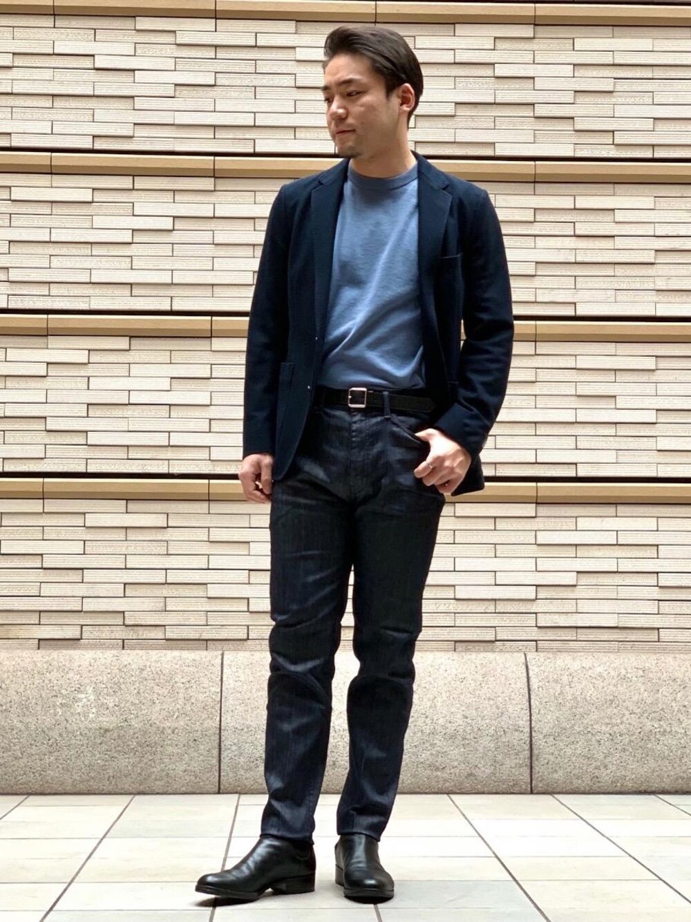 《身長172cm》着用size:jacket 44/pants M/knit S 普段着、お仕事着で使えるデニムスラックスを取り入れ、程よくカジュアルなワークスタイルに。