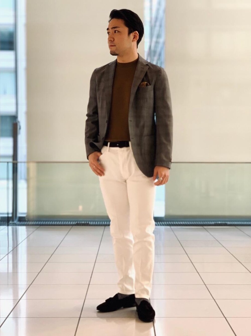《身長172cm》着用size:jkt 44/pants M/knit S 今季らしいイエローのニットを挿し色に使ったスタイルです。新鮮な色味にはグレーのジャケットを選び、大人らしいスタイルに。